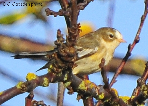 A partially albino Yellow-rumped Warbler causes one too do a double take! This bird was observed at Boundary Bay.