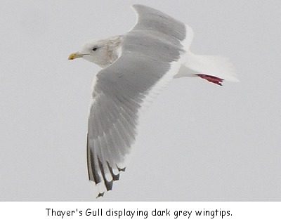 A Thayer's Gull is smaller and petit looking 'large' gull. A rounded head, dark eyed gull with a short bill often stands out among the larger and more bulky gulls. Wingtips are black or very dark grey on a folded wing but when in flight, the black is rather sparse; especially on the under wing and can seem to be more of a dark grey. Herring Gulls typically have much more black in their wingtips when viewed in flight. Often extensivly streaked on head and neck during the winter.