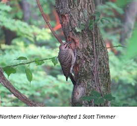Northern Flickers can be seen year round in the Fraser Valley. Pure Yellow-shafted Flickers appear rarely in the Fraser Valley If you see a woodpecker sitting on the ground, it is probably a Northern Flicker. They will sit on the ground and eat beetles and ants. Their strangely curved bill helps them dig them up. You can see these birds in your backyard or in a park or hanging around a dead tree. They will sit in the dead trees and eat the insects that are eating the tree or that are using it as a home. There are two subspecies of Northern Flickers- Red-shafted and Yellow-shafted. If you are to the east of the Rockies it is probably Yellow-shafted. If you are to the west of the Rockies it is most likely Red-shafted. So how can you tell the difference between these subspecies? The Red-shafted has a red malar and a grey face while the Yellow-shafted had a black malar and a brown face. The name gives away what color shafts each subspecies has. The Red-shafted has red shafts and the Yellow-shafted has yellow shafts.